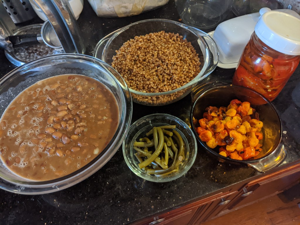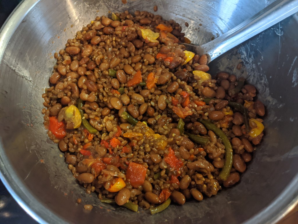 - While beans are cooking, cook wheatberries by adding 3:1 volume of water, raising to a boil, then covering and simmering 40-50 minutes, until softening but still chewy; strain off extra liquid when done