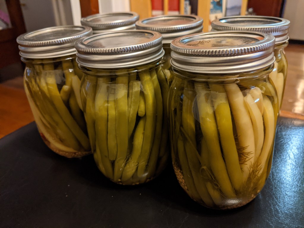 > jkd posted: ” A summer classic, to be enjoyed year-round! Ingredients 3 > lbs green and/or yellow wax beans, trimmed and cut into jar-length pieces > (about 4 inches)900 mL white vinegar900 mL water1/3 C. kosher salt6 cloves > garlic6 sprigs dill6 dry hot pepper6 tsp.” >
