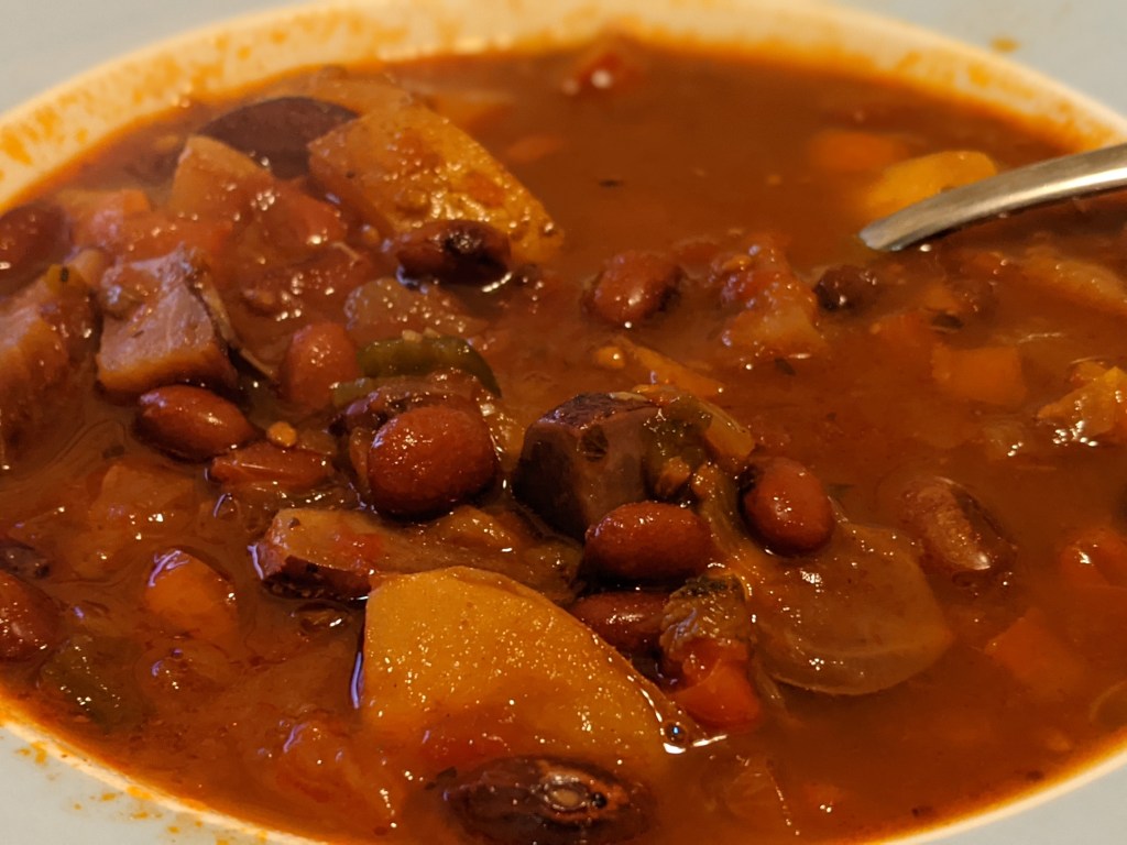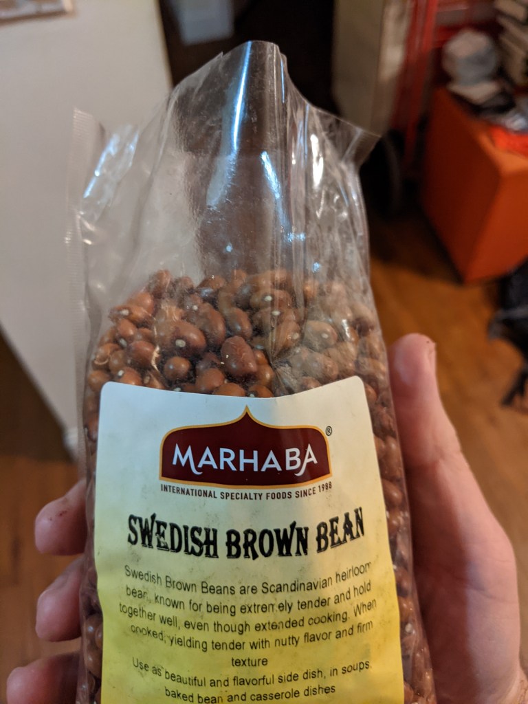 One of the new beans I discovered on my recent Kalustyan’s trip was the Swedish Brown bean, which they describe as a “Scandinavian heirloom bean, known for being extremely tender and hold together well, even though extended cooking. When cooked, yielding tender with nutty flavor and firm texture.” Sounds pretty good! But most of the recipes I’ve found focus on them as baked beans, with a lot of sugar or corn syrup – not what I’m feeling right now. So: a simple prep to start and be able to have them on their own, and then a soup with some nice heat and nutty potatoes to highlight the beans.