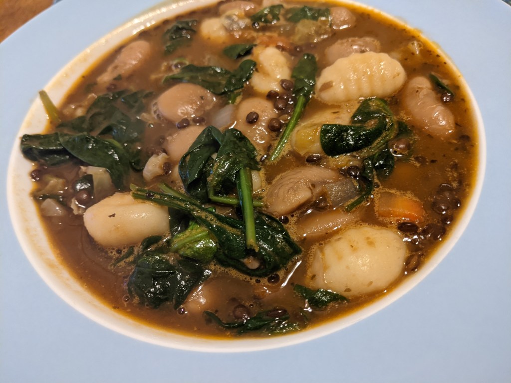 A cold winter night, achy bones – time for chicken noodle soup. With a twist! I’d already cooked up some lovely Royal Corona beans with aromatics, and had a few other odds and ends lying around, so: soup!